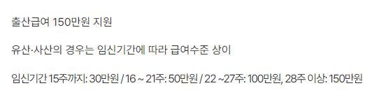| 지원 내용 | - 출산 시 150만원 지원 - 유산·사산 시 임신 기간에 따라 30만원~150만원 차등 지급 |